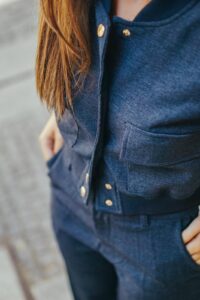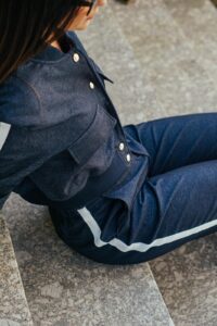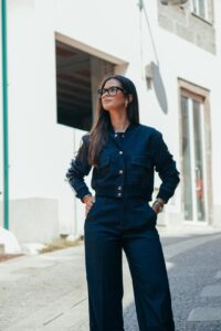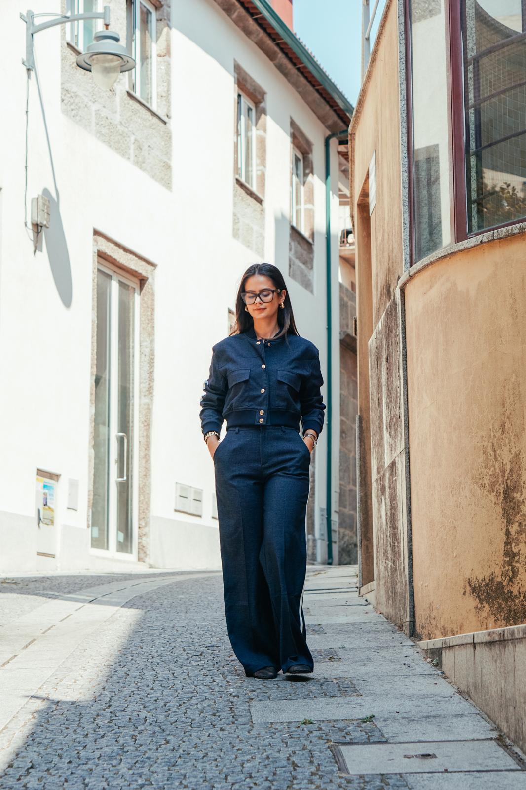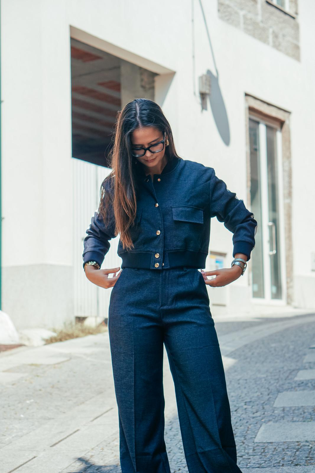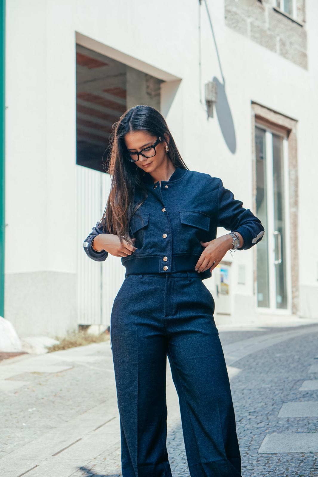 O casaco, com botões metálicos de acabamento polido e bolsos utilitários, traz um toque desportivo sofisticado, ideal para quem valoriza peças práticas mas cheias de estilo. As calças de corte largo e cintura alta garantem fluidez e movimento, resultando num look que alonga a silhueta e proporciona máxima elegância em qualquer ocasião.